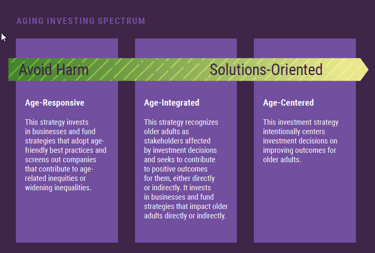Next50’s Aging Investment Framework is designed to be flexible, applicable across diverse portfolios – not just within traditional notions of impact investing – spanning the public and private markets, as well as all asset classes, geographies, markets, and investor types. We created an AIF taxonomy, or classification system, to help define and categorize investments based on their levels of impact: Age-Responsive, Age-Integrated or Age-Centered.